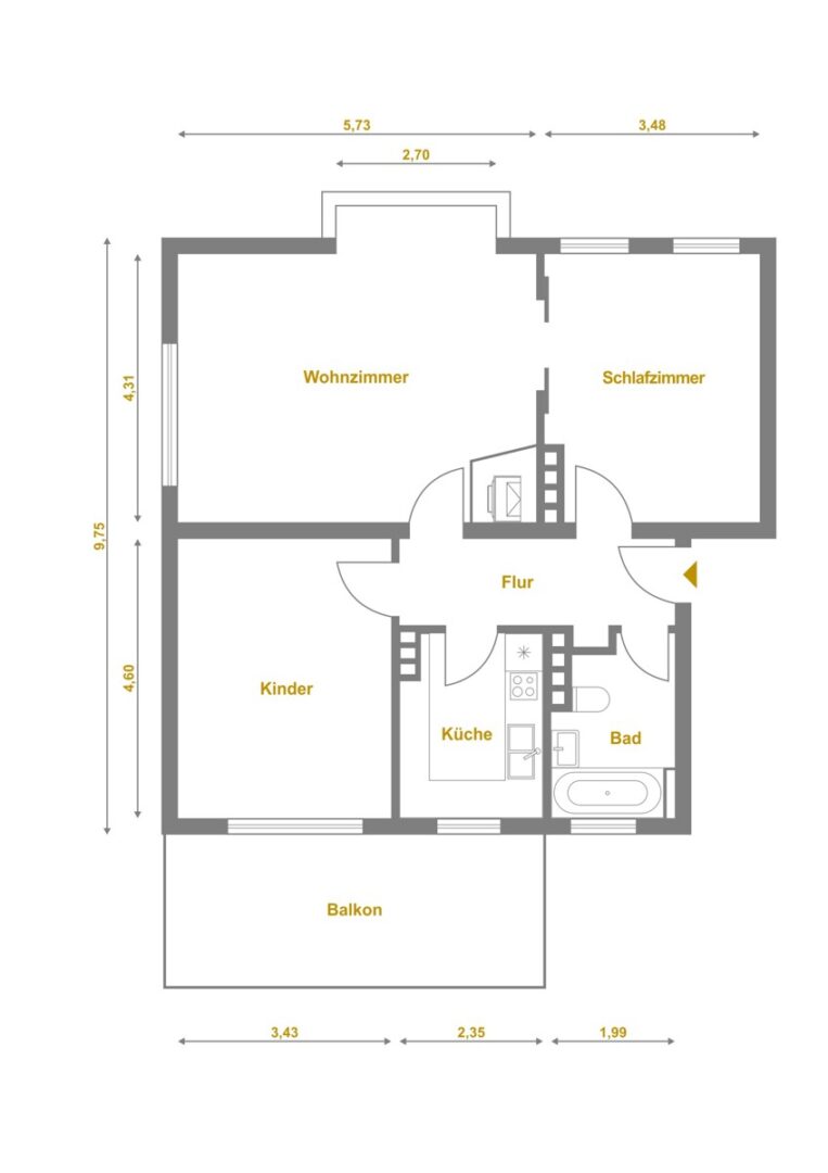 Auf rund 82 Quadratmetern verteilen sich drei Zimmer, von denen zwei als Schlafzimmer genutzt werden können. Der zentrale Flur dient als funktionaler Verteiler, sodass man linker Hand Badezimmer und Küche erreicht. Das Hauptschlafzimmer liegt am Ende des Flurs. Das Wohnzimmer und das zweite Schlafzimmer befinden sich rechts vom Eingang.