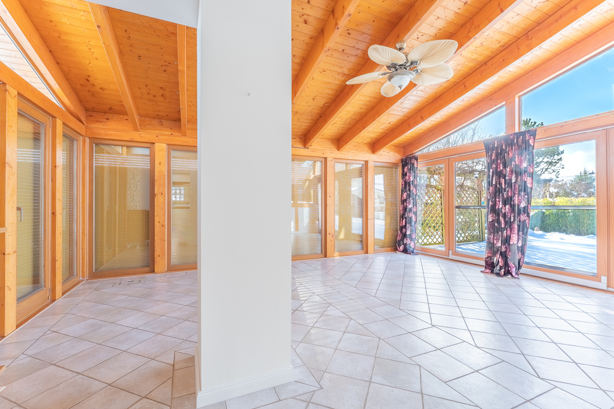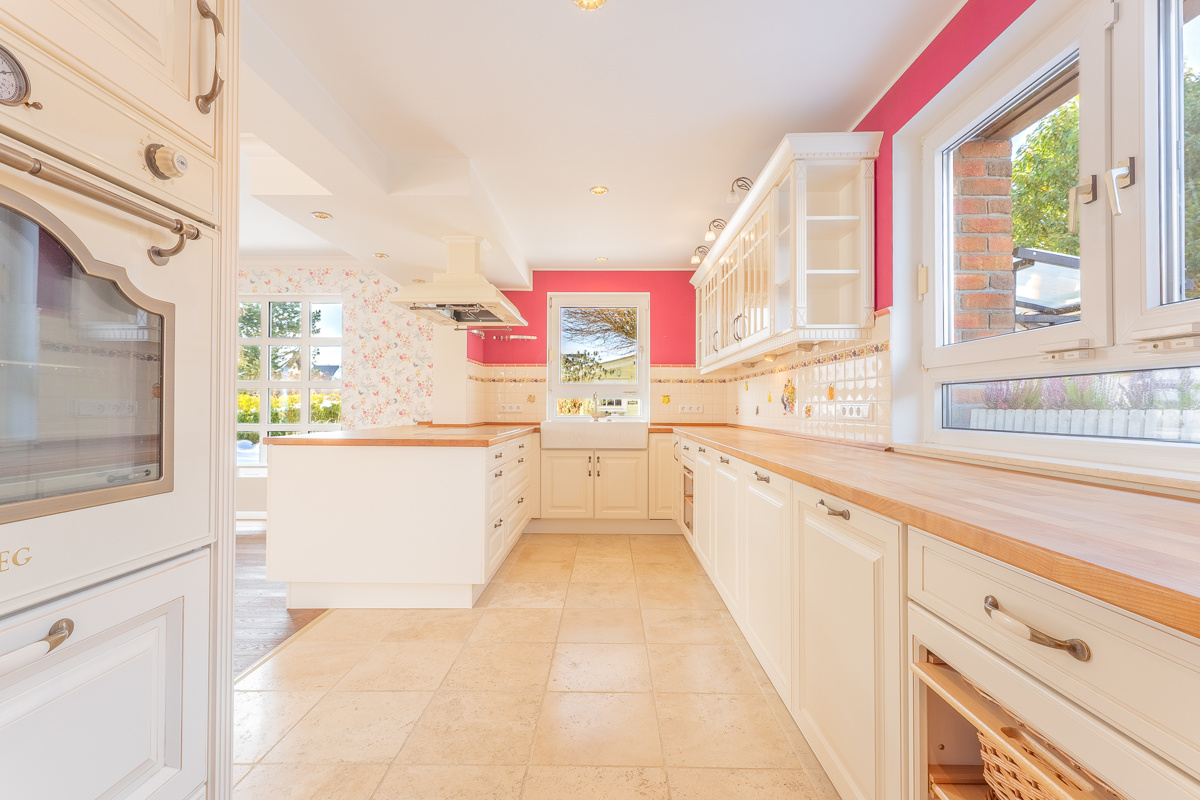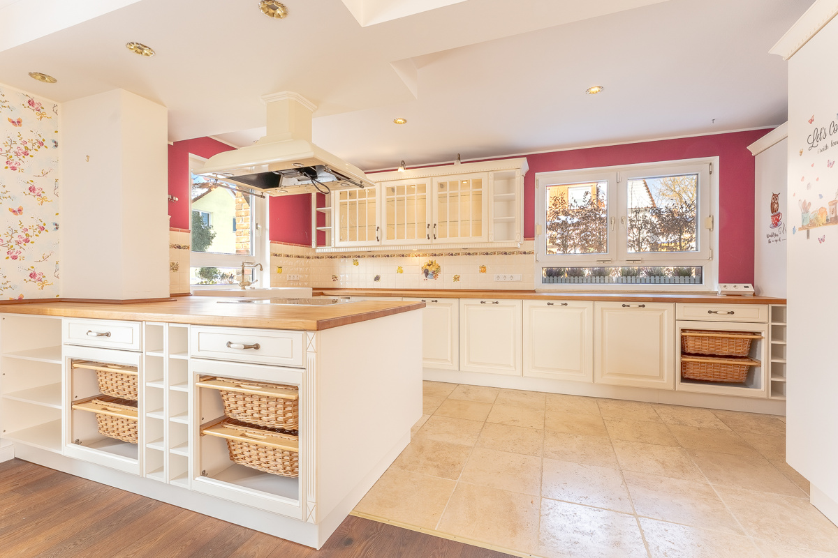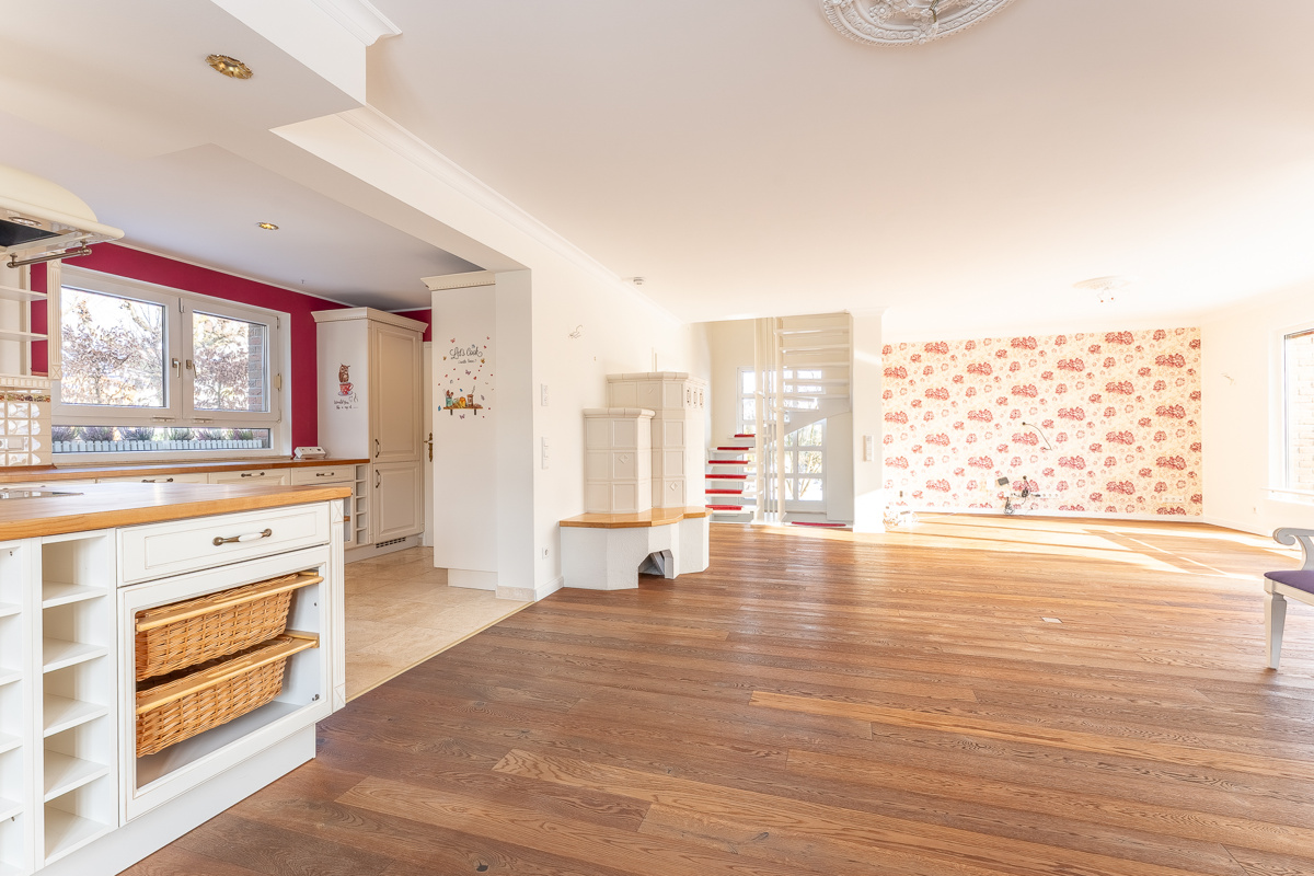 Bereits der Zugang zum Haus zeugt vom hohen Anspruch der Eigentümer, denn für den Zuweg sowie die Terrasse wurde zeitlos-feines Travertin gewählt, das Sie auch im Haus empfängt. Das ganze Objekt ist im Landhaus-Stil gestaltet, der sich mit Nachdruck in der großen, bis in die stilsichere Auswahl der Geräte und Armaturen umgesetzten Landhausküche zeigt. Die offene Küche ist Teil des beeindruckend großen und hellen Wohn-Ess- und Kochbereiches mit Kaminofen, der mit Echtholzparkett aus Eiche ausgestattet wurde und durch die vielen bodentiefen Fenster zu einem luftigen und lichtdurchfluteten Lieblingsplatz werden wird. Ergänzt wird dies durch den sehr großen und beheizten Wintergarten, ein optimaler Ort, um bereits beim Frühstück zu jeder Jahreszeit den aufwendig angelegten Garten zu genießen.