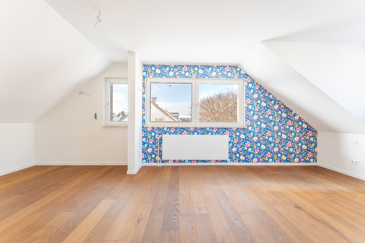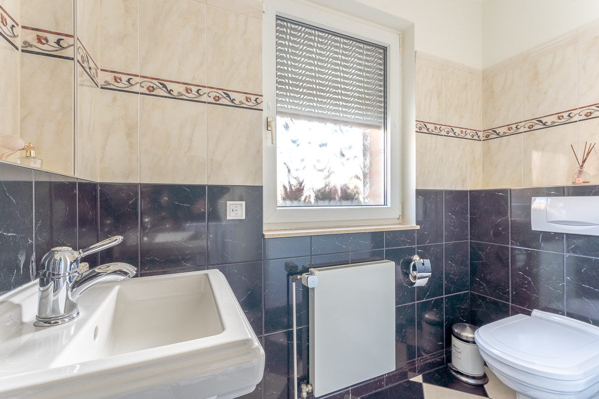 Auf der oberen Etage befinden sich zwei großzügig geschnittene Zimmer, eines mit einer Ankleide-Nische und eines mit einem traumhaften Blick über da Ahnatal bis hin zum Habichtswald. Komplettiert wird dieser komfortable Privatbereich durch ein bis ins Detail hochwertig ausgestattetes und mit Mosaikfliesen gestaltetes Badezimmer mit zwei Fenstern, übergroßer Badewanne und Regenwald-Dusche. Im Erdgeschoss befindet sich ein weiteres WC.