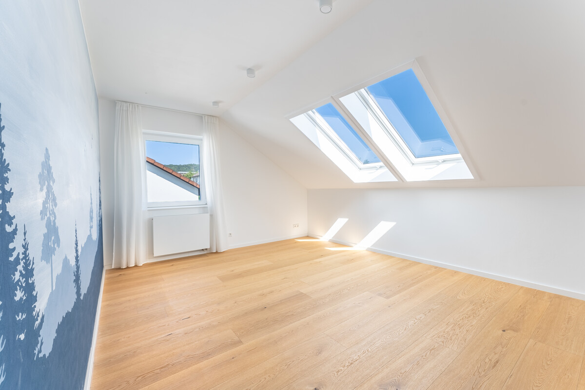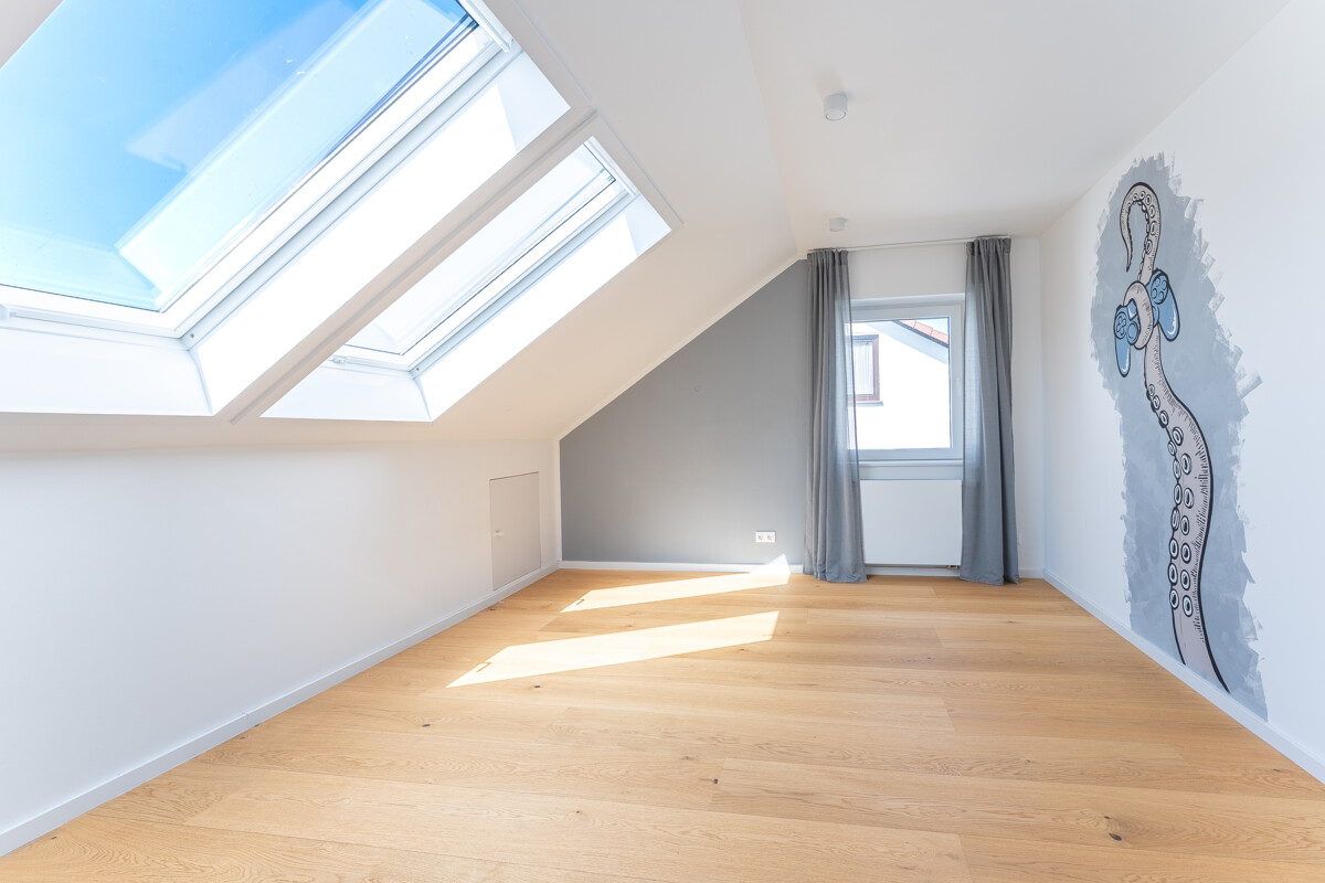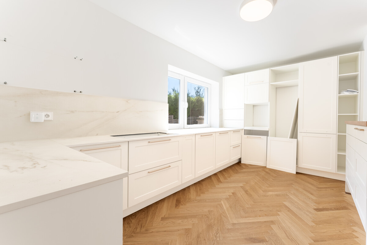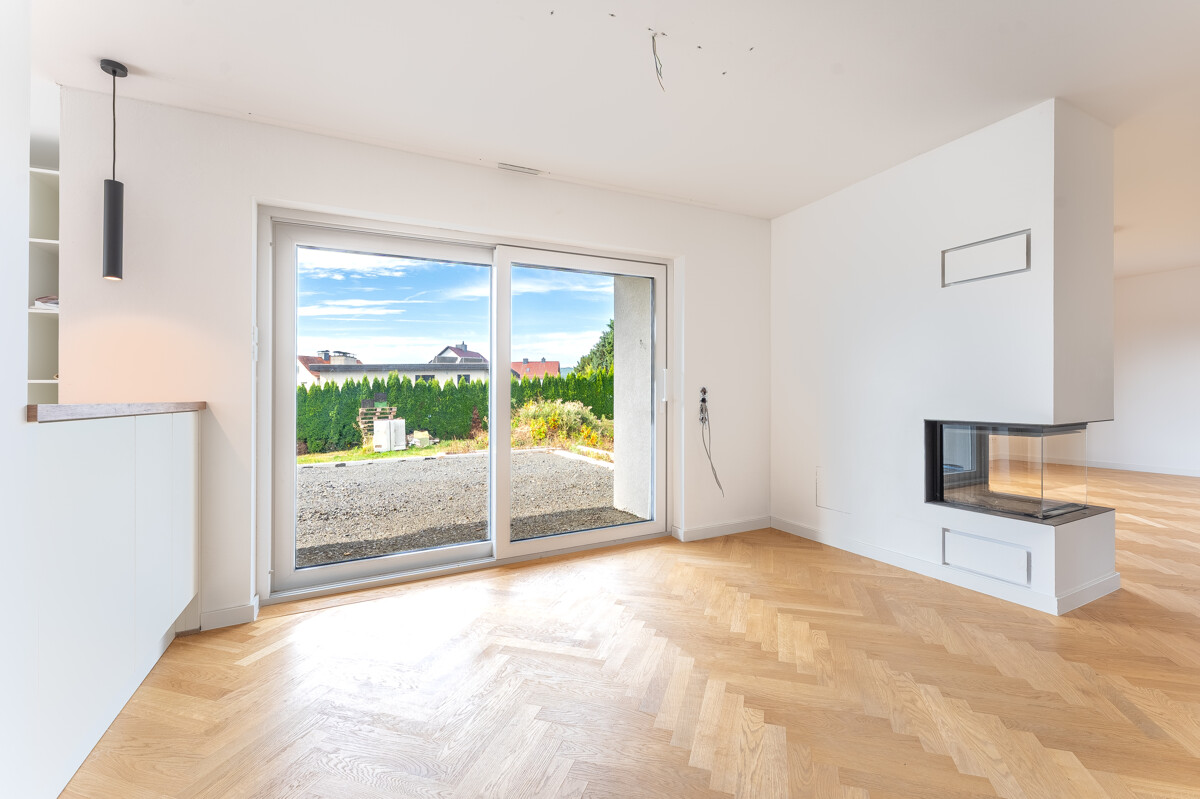Im Inneren wurde der Grundriss zeitgemäß und offen gestaltet. Besonders hervorzuheben ist der lichtdurchflutete Wohn-und Essbereich im Erdgeschoss, der mit einem hochwertigen Parkettboden ausgestattet ist. Die moderne Küche geht fließend in den Wohnraum über und bietet einen wunderbaren Blick auf den neuen Panorama-Kamin, der nicht nur wohlige Wärme spendet, sondern auch als stilvoller Raumteiler zwischen Wohn- und Esszimmer dient.