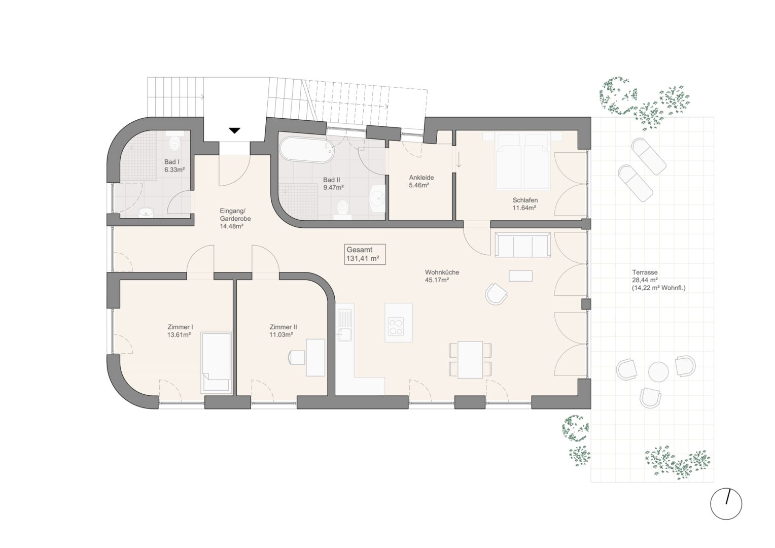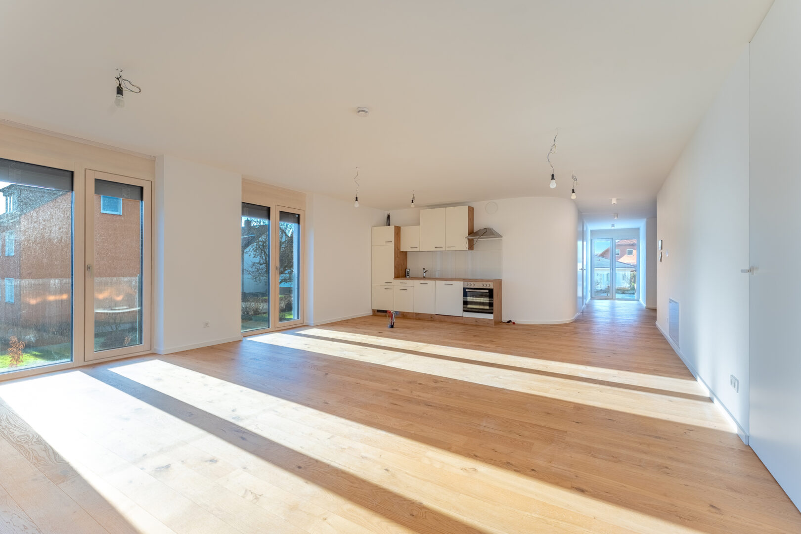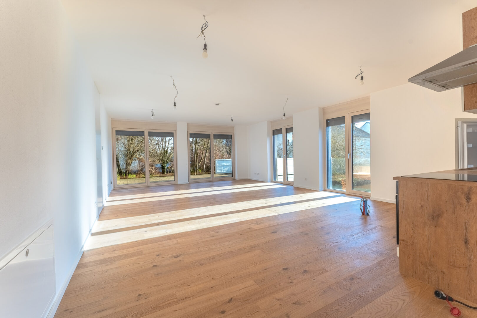 Die Erdgeschosswohnung dieses modernen Mehrfamilienhauses bietet auf rund 131 qm ein außergewöhnlich großzügiges, lichtdurchflutetes Zuhause, das Komfort, Ruhe und naturnahes Wohnen vereint. Der offene Grundriss schafft fließende Übergänge zwischen Wohnen, Essen und Kochen, während große Fensterflächen den Blick in den Garten ermöglichen. Drei der vier Zimmer eignen sich ideal als Schlafzimmer, Büro oder Gästezimmer. Ein Ankleidezimmer verbindet das Hauptschlafzimmer mit einem der beiden Tageslichtbäder, die mit gehobener Ausstattung, ebenerdiger Dusche und Badewanne überzeugen. Ein Abstellraum in der Wohnung sowie ein separater Kellerraum bieten zusätzlichen Stauraum. Der zur Wohnung gehörende Stellplatz sorgt für bequemes Parken. Ein besonderes Highlight ist der private Garten: Die Terrasse öffnet sich direkt ins Grüne, der gewachsene Baumbestand schafft ein angenehmes Mikroklima und verleiht dem Außenbereich eine ruhige, natürliche Atmosphäre.