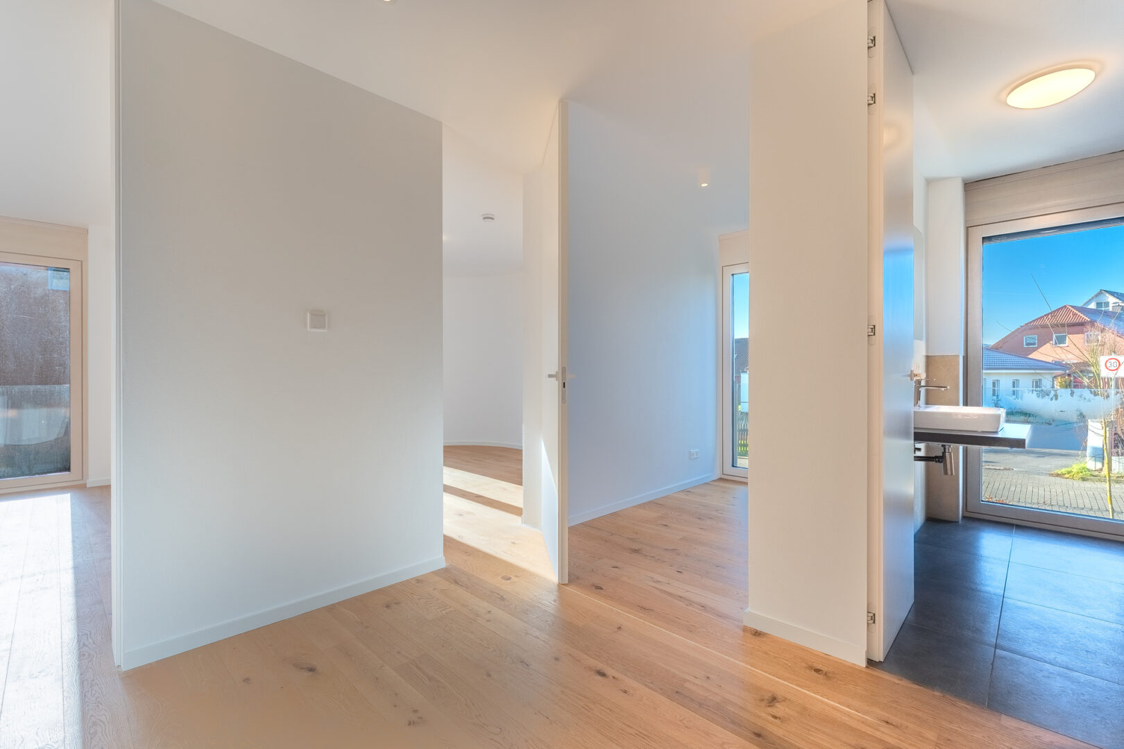 Jede Wohnung verfügt über eine moderne Videogegensprechanlage, Eichenparkett, Fußbodenheizung und eine kontrollierte Wohnraumlüftung. Balkone und Terrassen sind mit modernen, großformatigen Platten belegt und verfügen über Strom- und Wasseranschlüsse. Ein Carport kann optional, passend zum Design des Hauses, ergänzt werden. Die Photovoltaikanlage auf dem Dach unterstützt eine nachhaltige Energieversorgung und ermöglicht perspektivisch das Laden von E-Autos.