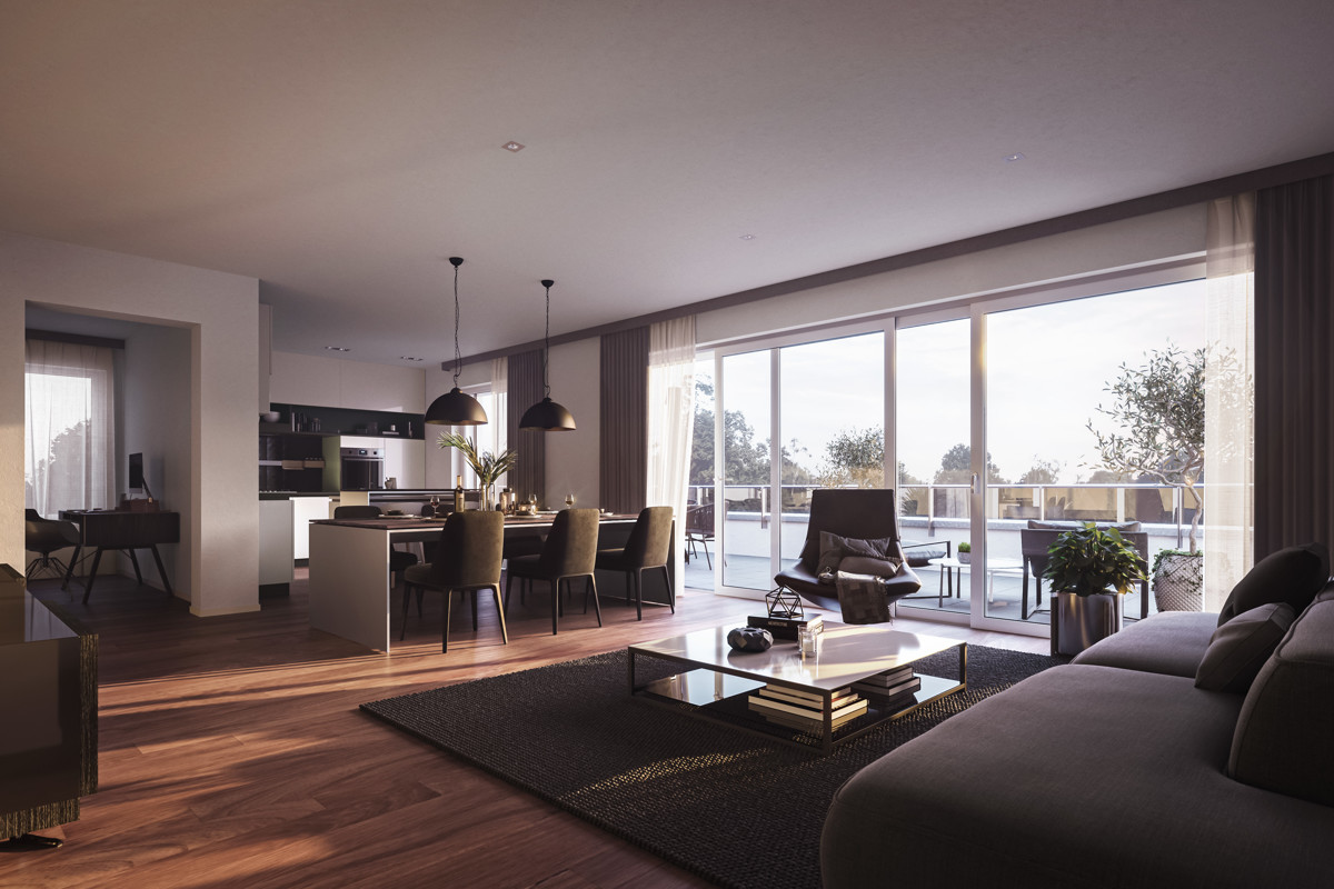 Jede der als Zwei- oder Dreizimmerwohnung geplanten Wohneinheiten ist hochwertig und modern ausgestattet und kann noch mitgestaltet werden. Die Böden im Wohnbereich werden wahlweise mit Eichen- oder Ahornparkett belegt. Flure, Küchen und Bäder werden mit Feinsteinzeug in hoher Qualität gefliest. Die Badezimmerausstattung ist sehr gehoben, komfortabel und zeitgemäß. Die Heizung erfolgt mittels Wärmepumpe über eine Fußbodenheizung, die Hauptbäder sind zusätzlich mit elektrischen Handtuchheizkörpern ausgestattet. Sie genießen die Vorzüge der Wasserreinigung durch Micro Clean sowie einer Anlage zur Vitalisierung Ihres Wassers. Sie nutzen bequem einen einen Personenaufzug sowie einen Highspeed-Internetzugang. Zu jeder Wohneinheit gehört ein Abstellraum im Untergeschoss, wo sich auch eine Tiefgarage mit zehn Stellplätzen befindet.