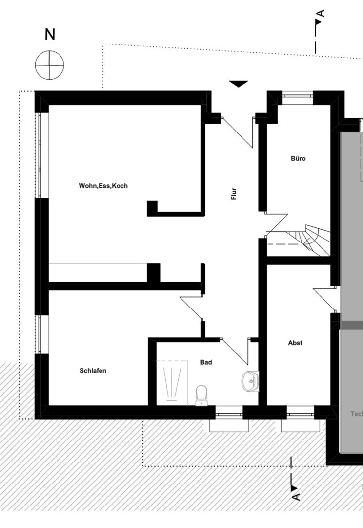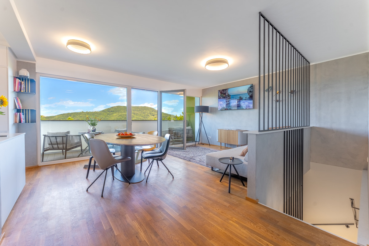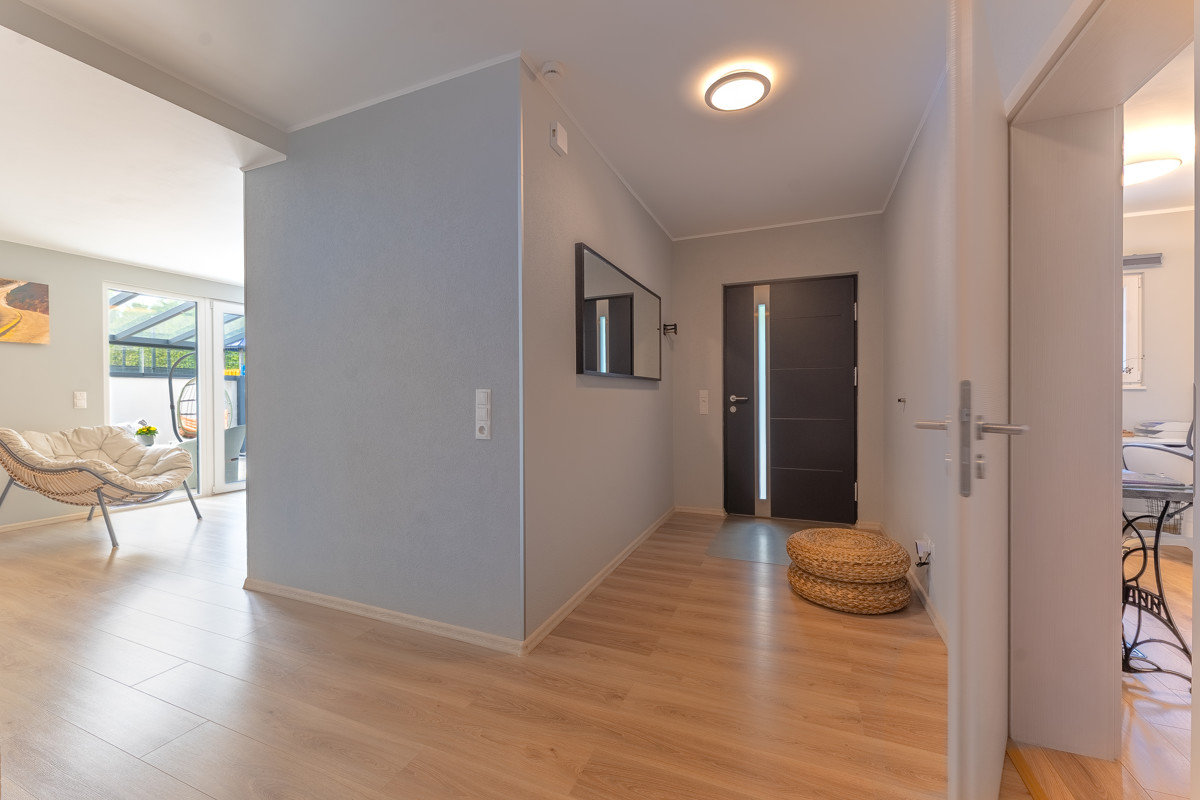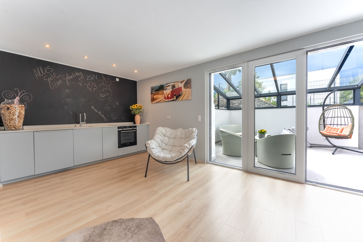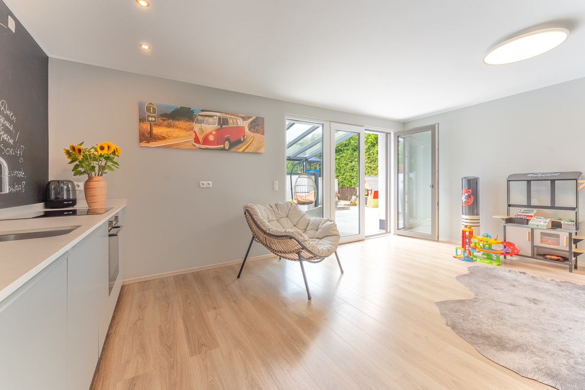 Auf der unteren Ebene finden Sie neben einem weiteren möglichen Schlafzimmer und einem kleineren Raum vor allem den fast 27 Quadratmeter großen zweiten Hauptraum mit großer Fensterfront und Zugang zur nach Westen ausgerichteten und teilweise überdachten Terrasse sowie zum Garten, in dem Sie den ganzen Tag über Sonne haben.