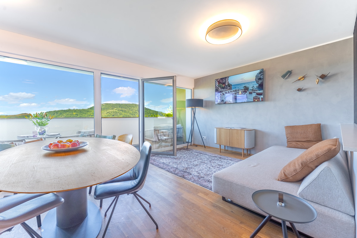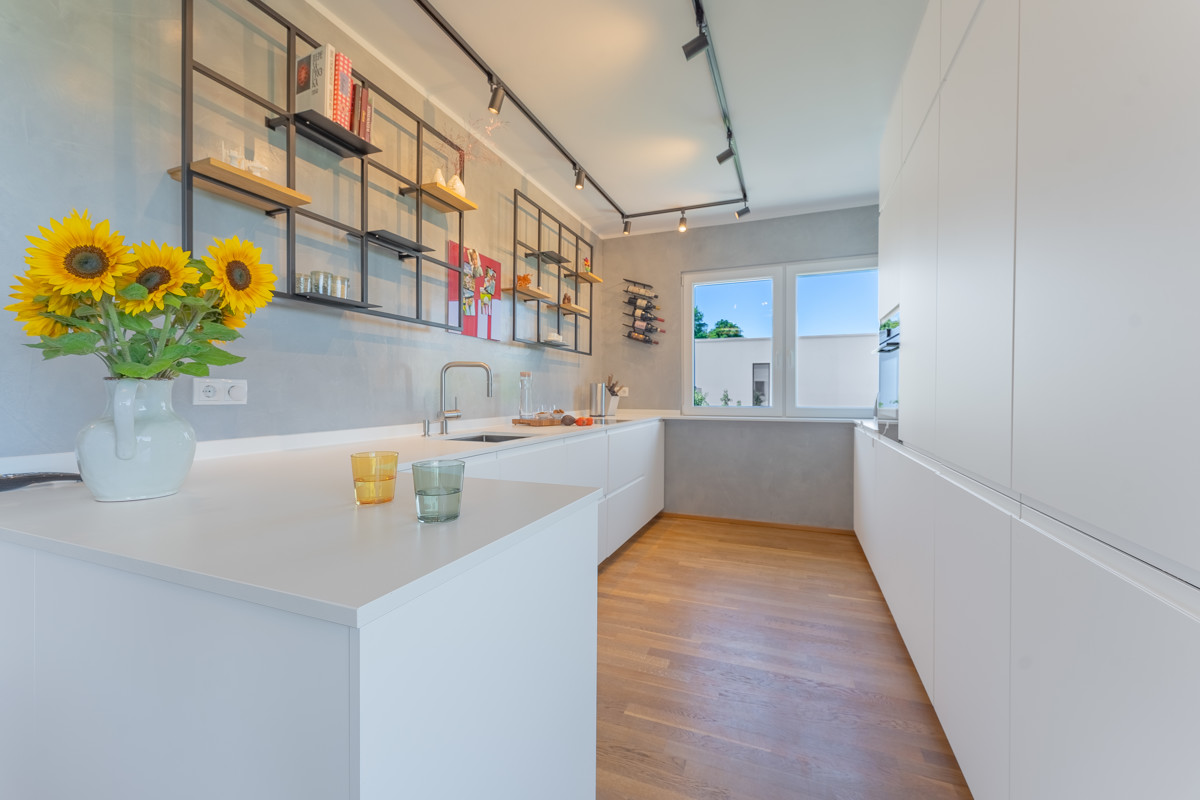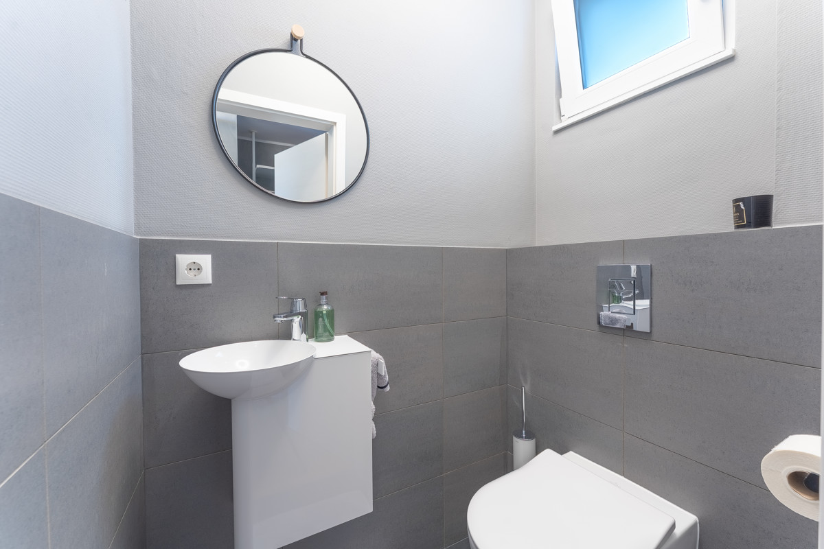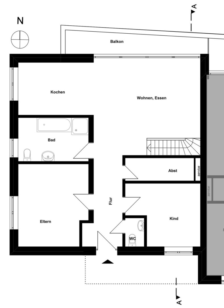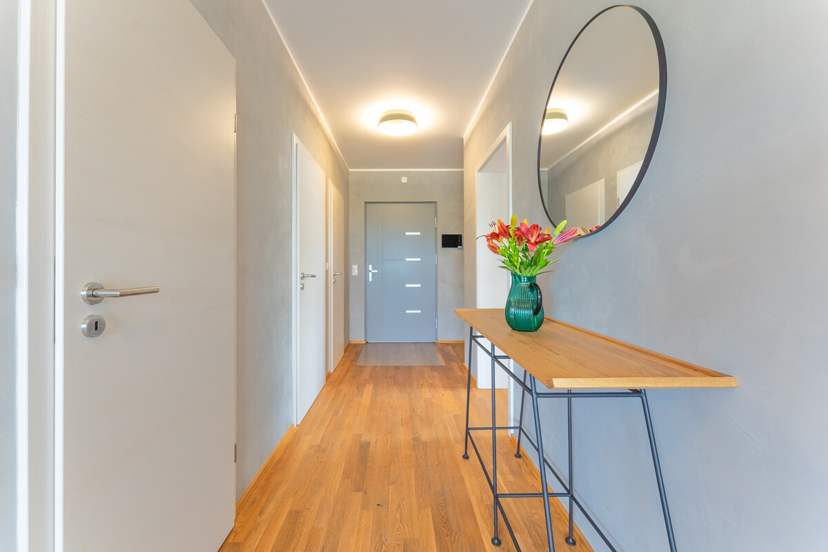 Auf der unteren Ebene finden Sie neben einem weiteren möglichen Schlafzimmer und einem kleineren Raum vor allem den fast 27 Quadratmeter großen zweiten Hauptraum mit großer Fensterfront und Zugang zur nach Westen ausgerichteten und teilweise überdachten Terrasse sowie zum Garten, in dem Sie den ganzen Tag über Sonne haben.