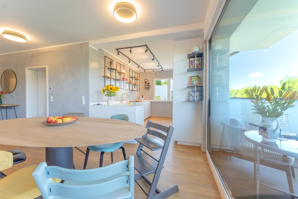 Auf der oberen Ebene der Wohnung befindet sich ein großer Wohn-, Ess- und Kochbereich mit einer gut ausgestatteten Küche aus dem Jahr 2022 sowie Zugang zum Balkon. Von hier aus genießen Sie nicht nur die Ruhe, sondern vor allem den Blick über das Dorf hinweg ins Grüne zum Hohen Dörnberg. Weiterhin befinden sich auf dieser Etage zwei flexibel nutzbare Räume sowie ein Badezimmer mit Wanne und Dusche, ein WC und ein Abstellraum.