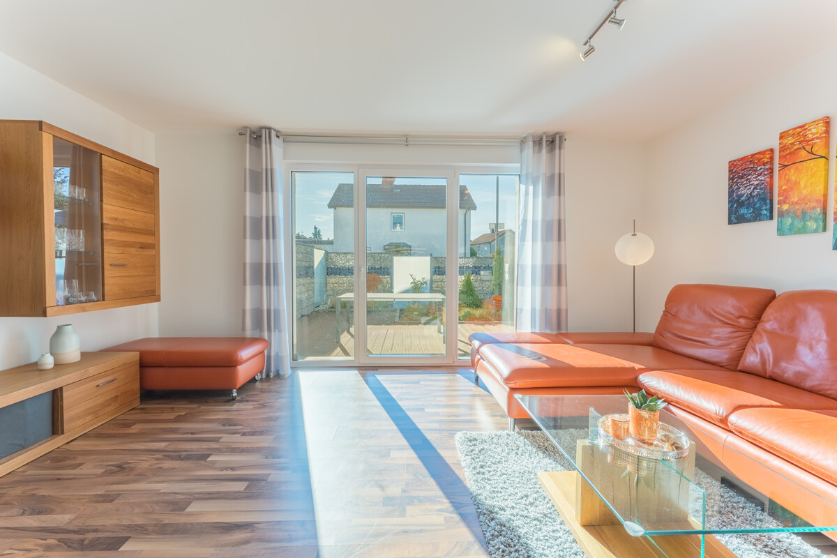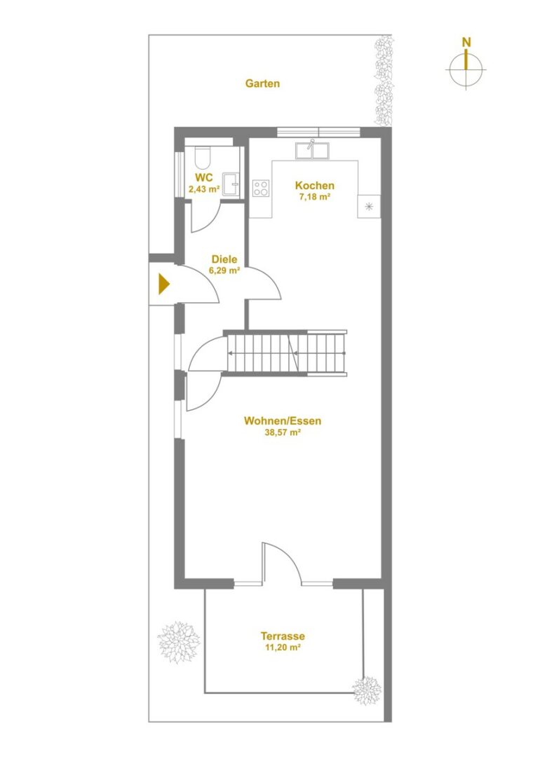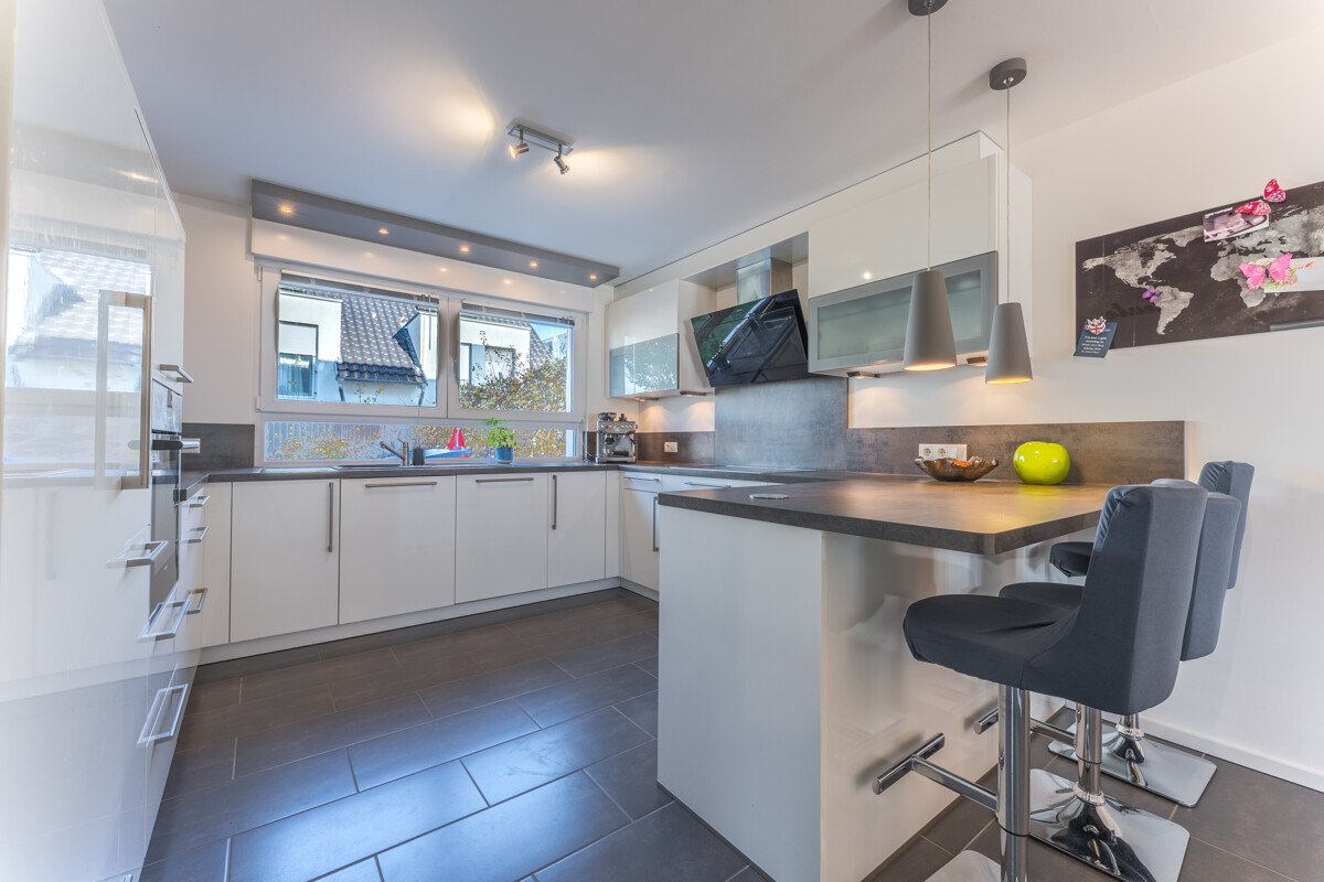 Hinter dem gefliesten Eingang mit Gäste-WC finden Sie auf beinahe der ganzen Grundfläche des Hauses einen etwa 45 Quadratmeter großen, offen gestalteten Koch-, Ess- und Wohnbereich. Gerade die helle und einladende Küche mit hochwertiger Ausstattung, sehr viel Stauraum und neutralen Fronten bildet einen echten Lebensmittelpunkt für Familie und Gäste; der sich anschließende, leicht separate Wohnbereich mit Ausgang auf die nach Süden ausgerichtete Terrasse bietet einen gemütlichen Bereich zum Entspannen.
