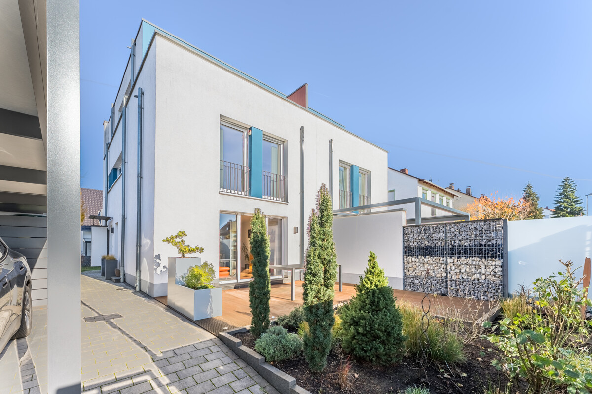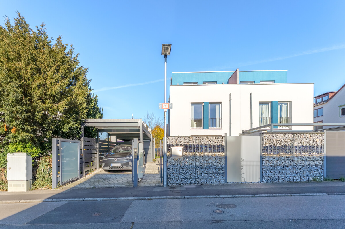 Der Garten ums Haus wurde mit Liebe und pflegeleicht angelegt. Neben einer kleinen Rasenfläche hinter dem Haus und der sichtgeschützten Terrasse vor dem Haus finden Sie auf dem Grundstück auch ein Carport mit Wallbox sowie einen Lagerraum für Gartengeräte und Fahrräder.