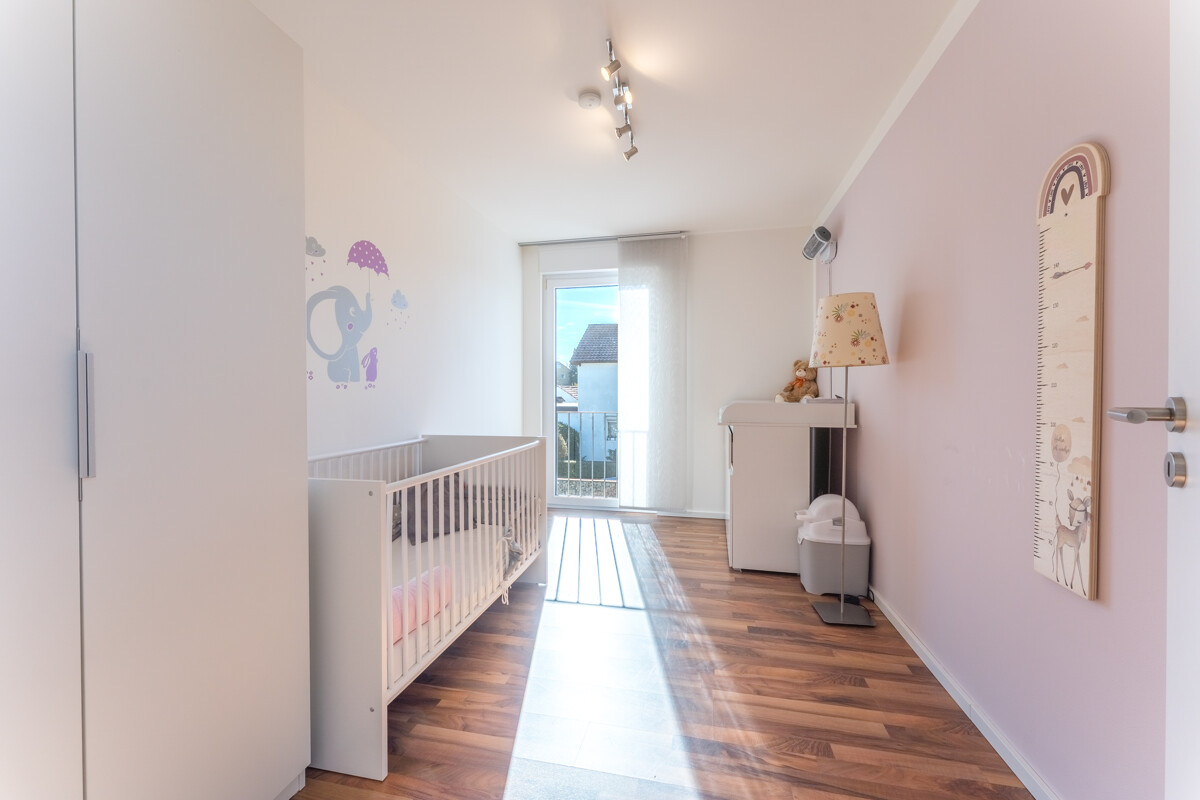 Über eine geschlossene Echtholztreppe gelangen Sie ins erste Obergeschoss des Hauses. Hier befinden sich insgesamt drei Schlafzimmer, nämlich ein größeres für die Eltern und zwei etwas kleinere, fast exakt gleich große Räume. Beide sind mit bodentiefen Fenstern ausgestattet und dadurch sehr hell, können aber, wie auch alle anderen Räume des Hauses, durch elektrische Rollläden verdunkelt werden. Das große Familienbad, das sich ebenfalls auf dieser Etage befindet, ist mit Badewanne und Dusche großzügig ausgestattet und gestaltet.
