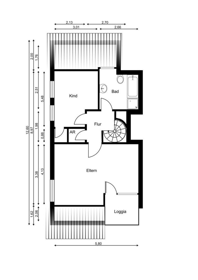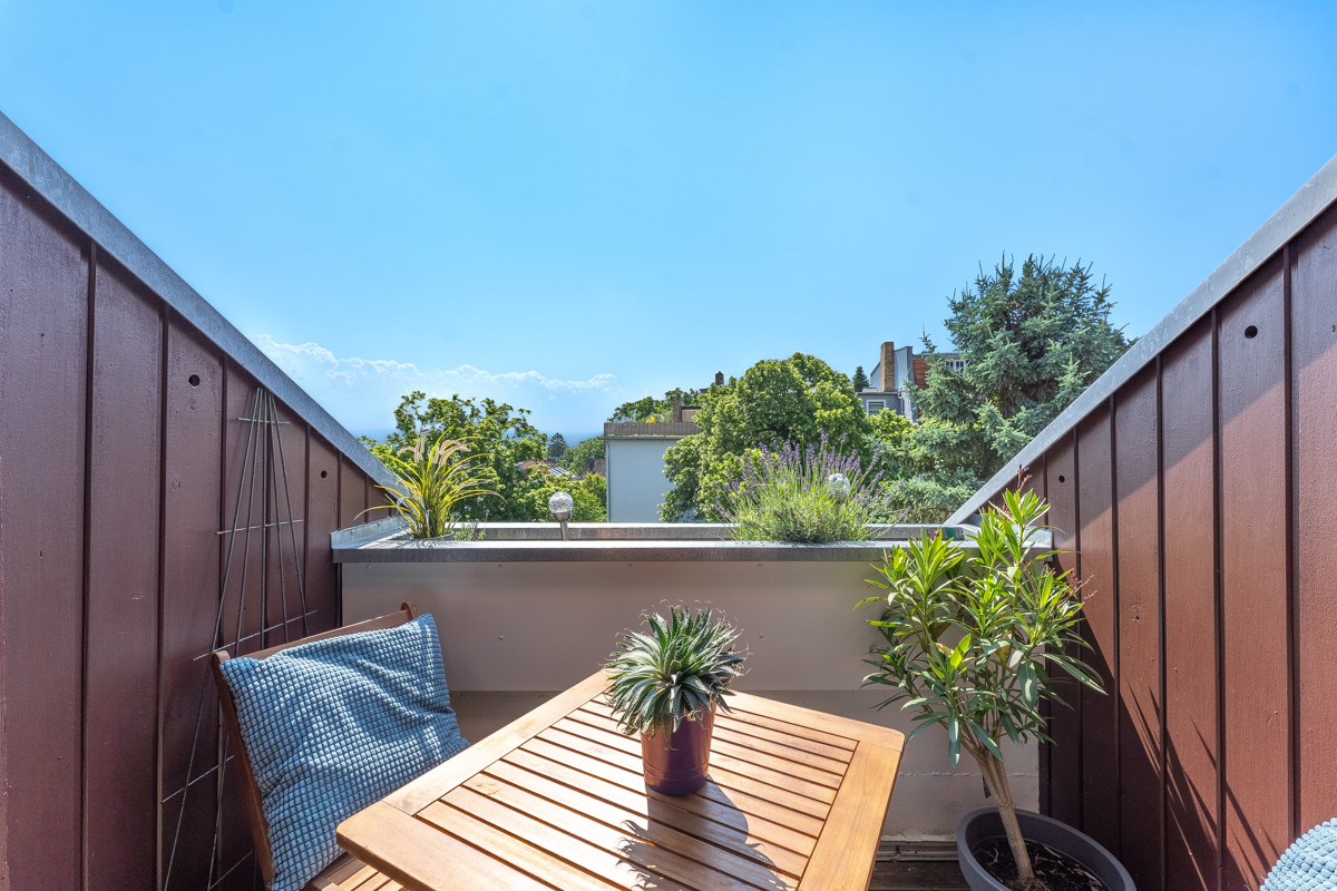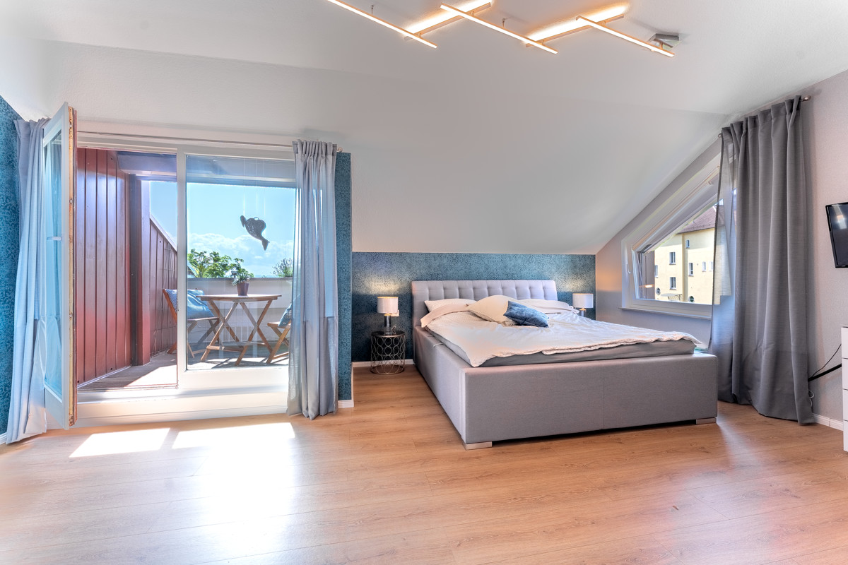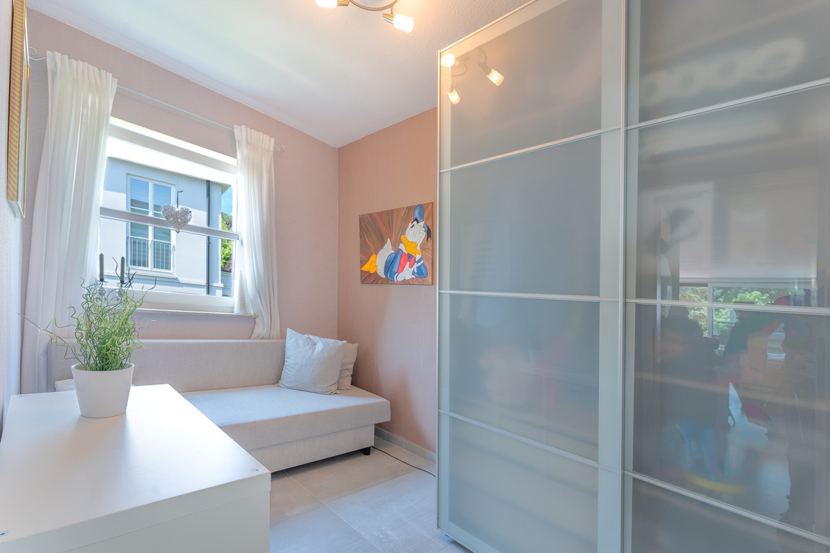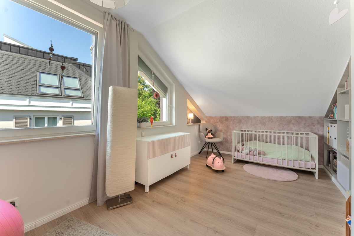 Über eine Wendeltreppe mit neuen Eichenstufen gelangen Sie in den Schlafbereich im Dachgeschoss der Wohnung. Hier wurde, während das Erdgeschoss mit großen Fliesen ausgestattet wurde, hochwertiges Laminat verlegt. Alle Räume haben eine sehr angenehme Größe und sind sehr hell und gepflegt. Das Kinderzimmer verfügt über in die Schräge eingepasste Einbaumöbel. Gemütlich ist auch das große Hauptschlafzimmer, das über einen Zugang zu einer Loggia verfügt, auf der man den Tag im Sommer besonders schön ausklingen lassen kann. Im Obergeschoss befinden sich zudem eine Abstellkammer und nicht zuletzt ein großes, neuwertiges und helles Wannenbad. Zur Wohnung gehören ein Kellerraum und ein Stellplatz in der Tiefgarage.