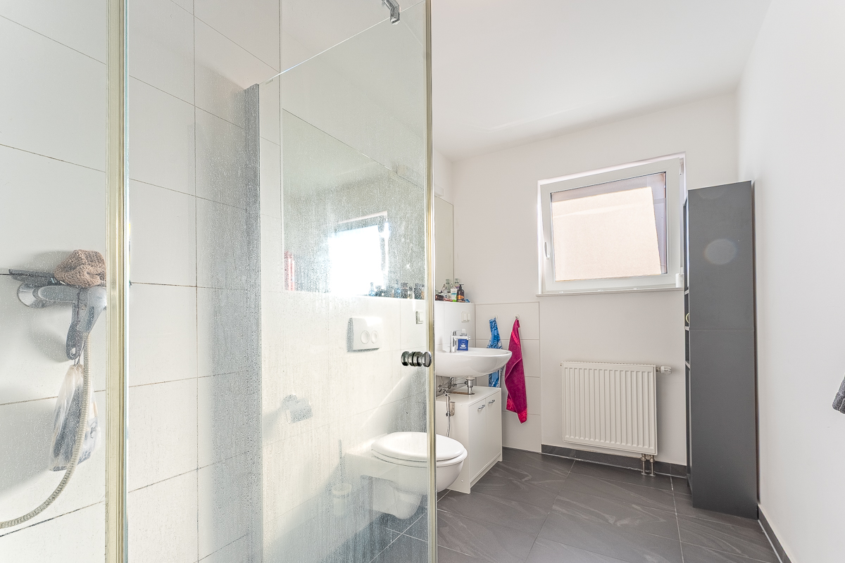 Das Tageslicht-Badezimmer ist neutral gestaltet und mit einer Dusche ausgestattet. Während hier der Boden gefliest wurde, wurde in Wohn- und Schlafzimmer langlebiger Vinylboden verlegt.