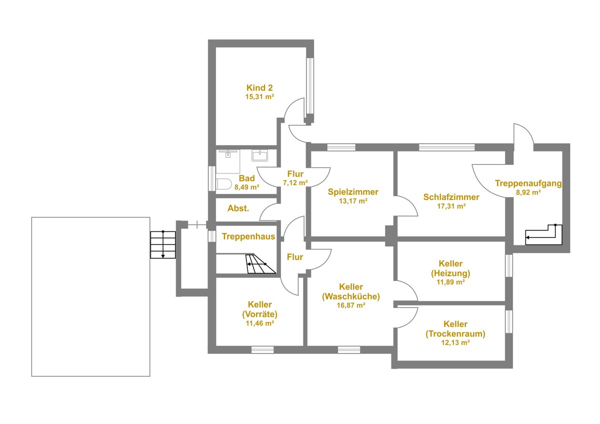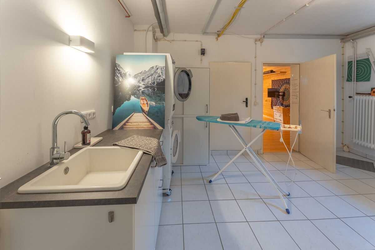 Das Haus verfügt im hinteren Teil des Kellergeschosses über ausreichend Nutzfläche in Form von einer Waschküche, einem Heizungskeller, einem Abstellraum und einem ausgebauten Hobbyraum.