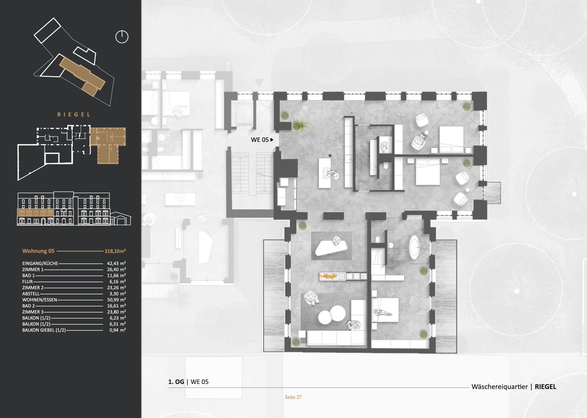 Neben dem von der Straße aus sichtbaren NEUBAU verbergen sich im aufwendig angelegten Hof die historischen, etwa 120 Jahre alten Objekte PUNKTHAUS mit zwei Wohneinheiten und RIEGEL mit 15 weiteren Wohneinheiten. Beide Gebäude wurden komplett saniert und umgestaltet.